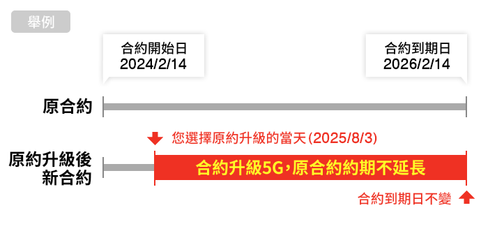 - 如申辦時已無 4G 合約或升級 5G 方案後調降資費,將不享有升級 5G 方案所給予之方案優惠。升級 5G 方案優惠使用期間至原 4G 合約到期日。5G 合約到期之計費方式:了解更多