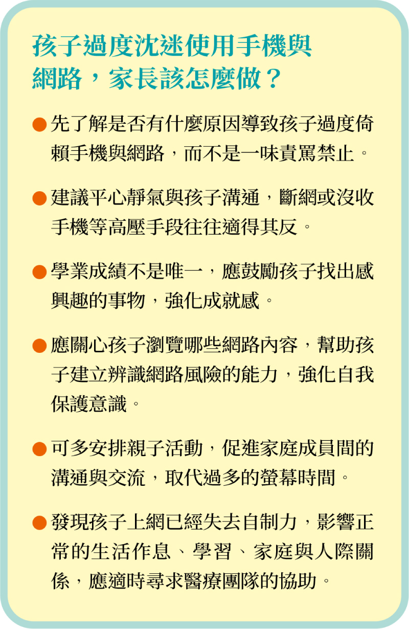 如果孩子真的過度沉迷網路,通常是一種「訊號」,可能反映了孩子在現實生活中缺乏支持、動力或成就感,要處理的可能不是上網這件事,而是要探究行為背後的原因,進而引導孩子應對現實生活中的困境,才能改變過度倚賴網路的行為。