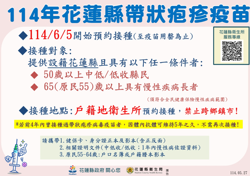 花蓮縣帶狀疱疹疫苗從2025/6/5開始預約接種。(圖片來源:花蓮縣衛生局)