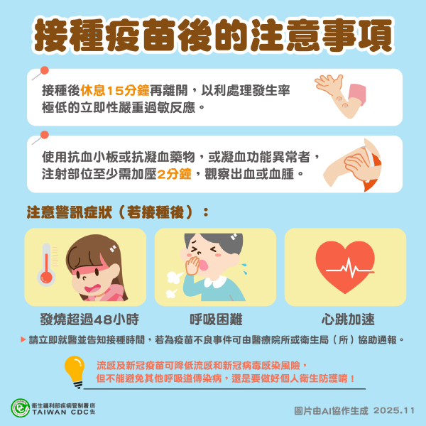 完成疫苗接種後,記得不要立刻離開醫院,最好先在接種地點附近休息觀察至少30分鐘,確認沒有立即性的不適症狀後再離開。