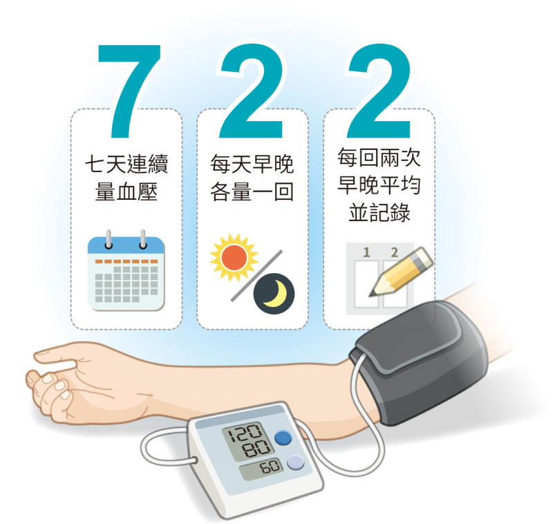 為能掌握自己的血壓狀況,應居家按部就班正確量血壓,做好相關紀錄,就醫回診時,提供醫師參考。建議18歲以上民眾每年至少要量一次血壓,而高血壓患者應牢記「722」量血壓密碼:「7」連續七天量測、「2」早上起床後、晚上睡覺前各量一次、「2」每次量兩遍,透過「定期量測」清楚掌握血壓變化狀況,是做好血壓管理的重要關鍵。