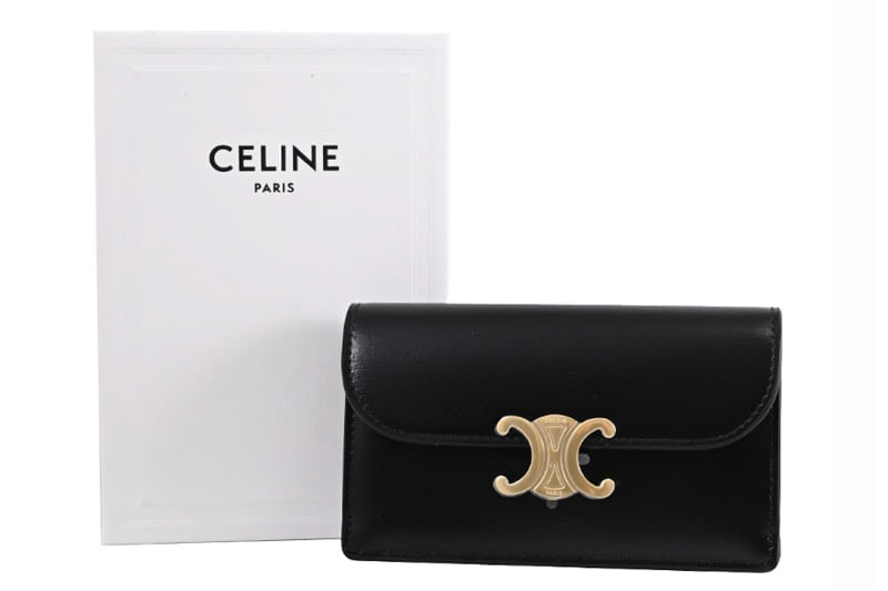 CELINE TRIOMPHE系列配件是熱銷款,這款皮夾最大特色是採用質感小牛皮材質搭配品牌金屬LOGO,扣式開口,展現出低調奢華的都會感,而內有1拉鍊零錢袋,外4卡夾層與1夾層可供收納,使用方便。