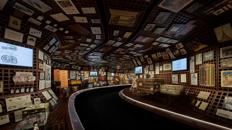 旅程始於「Trunkscape」展間,訪客穿越由經典圓帽箱組成的隧道,象徵品牌開創性的旅行藝術。螺旋階梯包覆著動態LED螢幕,生動地勾勒出品牌工藝的時間軸。五樓的「起源 Origins」展間則以六個篇章,深入探索Monogram的誕生、時尚打包藝術、運輸、探險等關鍵時刻,展現路易威登每一項發明皆源於對旅程的回應。