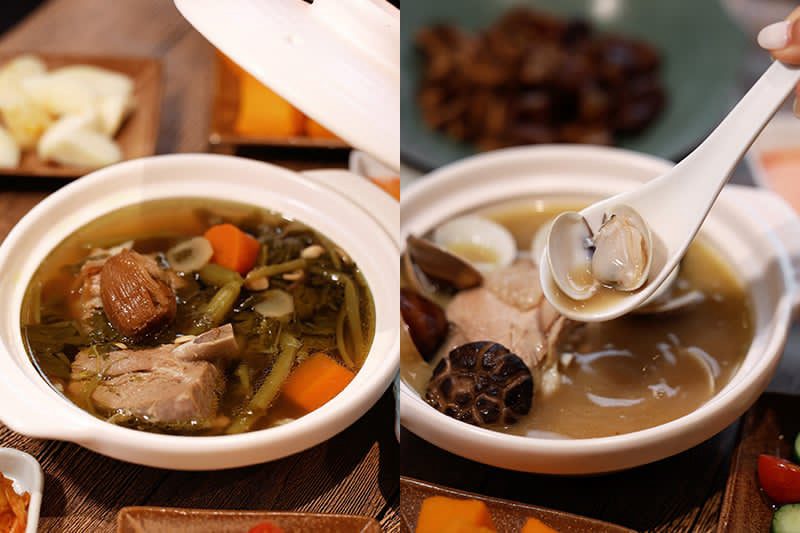 左為西洋菜胡蘿蔔蜜棗排骨湯,右為蛤蜊花菇雞腿湯。(圖片來源:好好養湯)