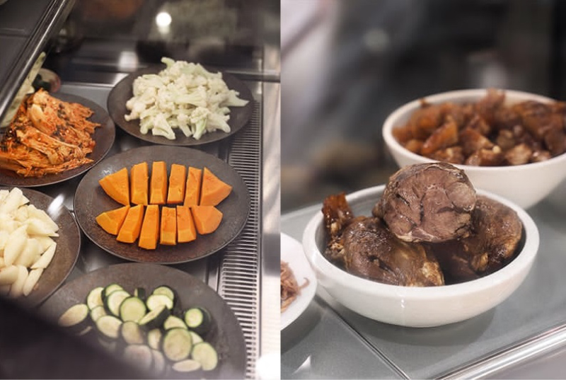 還有另外二款湯品,黃耆黨參花菇雞腿湯(280元)滋補強身、 蛤蜊花菇雞腿湯(280元)溫潤醇厚也都值得一試,不妨就多來幾次吧。對了,可別以為這裡只有湯,來吃正餐會吃不飽,澱粉類有黑金滷肉飯、黑金滷肉拌麵、雞汁麵線等,每份60元的小菜也美味,如烏魚子茭白筍、山藥毛豆仁、蜜香南瓜、柚香櫻桃番茄小黃瓜、鹽麴白花菜等,潮州滷味更是名廚林明健拿手好菜,幾乎每桌都會點上一盤。