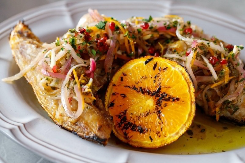 驢子餐廳的「爐烤青魽魚下巴、橙香紅蔥酒醋汁」,魚肉油脂與香氣迷人,搭配了由柳橙汁、柳橙皮與紅蔥酒醋調製而成的醬汁,帶出明亮酸香,讓濃郁口感更顯清爽。(圖片來源:驢子餐廳)