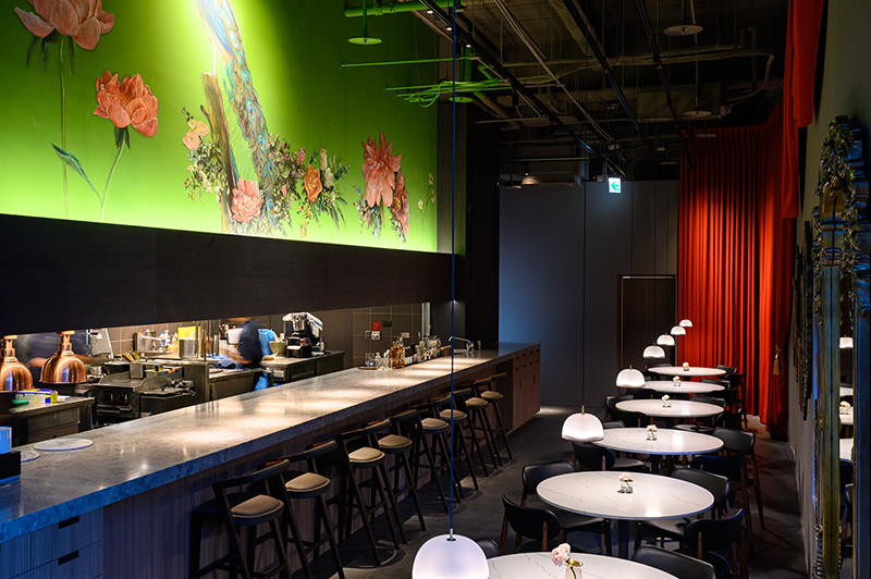 夏花餐室的用餐區與餐吧,屬狹長型空間,左上角的手工壁畫,氣勢驚人,另有一包廂設計。(圖片來源:夏花餐室)