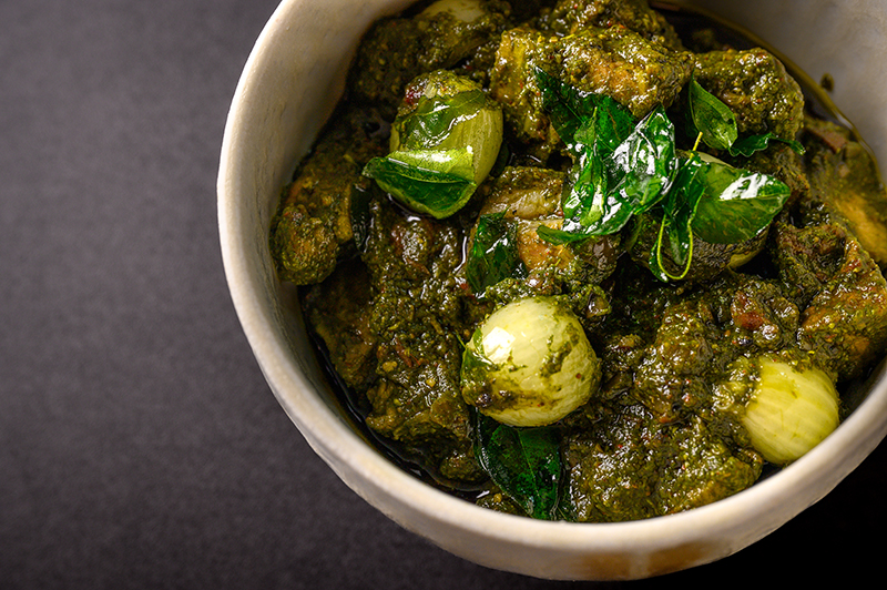 咖哩,是不少人對印度料理的首要印象,就先來介紹二款你肯定沒吃過但又很好吃的咖哩。「Karnataka Coorg Pork庫格的豬五花黑咖哩」是駐店主廚Wilfred的家鄉菜,以黑醋、多重香料、焦糖化的紅蔥頭慢燉細熬來自田尾胡蘿蔔豬的豬五花,並添加黑芝麻與菠菜泥,賣相雖然沒那麼好看,但吃來不辣口,油脂與香料香氣完美交融,口感與層次皆豐富,一吃就會喜歡