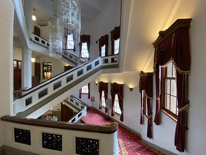 挑高的樓梯間垂掛著大型的燈具,以象徵著台灣和平的野百合花為造型,讓人們感受到每一步的民主果實都得來不易。而這棟建築本身是由日本建築師井手薰所設計興建,當年一開始被作為台灣教育會館所使用,因此二樓特別挑高三米,可作為各種不同展演使用。