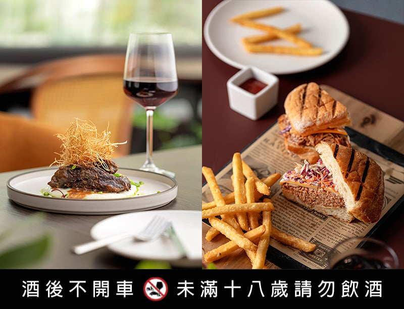 左為紅酒燉牛頰,肉質相當軟嫩。右為好吃涮嘴的BBQ豬肉古巴三明治。(圖片來源:國聯大飯店)
