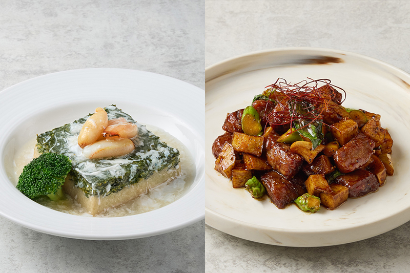 賽螃蟹手工菠菜豆腐(左)、黑胡椒牛菲力(右)一個味道清爽、一個風味濃郁,是來店必吃的明星菜!(圖片來源:樂天皇朝)