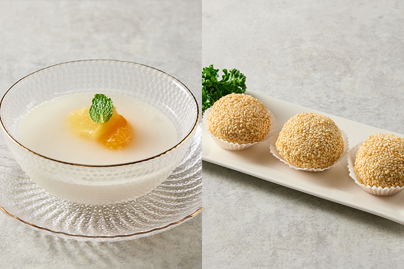 手工杏仁豆腐(左)、皇朝芝麻叉燒酥(右)是樂天皇朝的經典款甜品。(圖片來源:樂天皇朝)