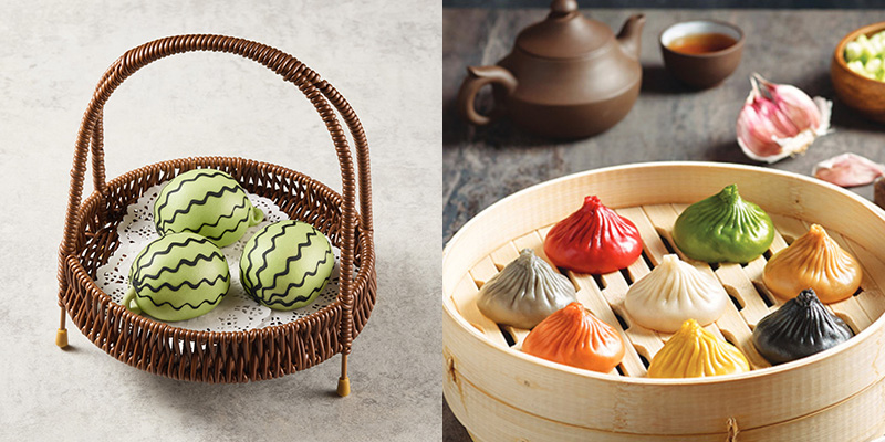 小玉奶皇包以台灣小玉西瓜為造型靈感,麵皮是天然蔬菜汁揉製,表面手繪上竹炭粉西瓜紋,剝開後還可見以黑芝麻做的西瓜子,內餡為流沙與奶皇雙重堆疊,流沙以頂級美國奶油與鹹蛋黃調製,奶皇餡則加入香草醬、牛奶與雞蛋製作,柔滑不膩口。吃著涼菜,再搭配一罐濟州柑橘果實氣泡酒,消暑爽口。