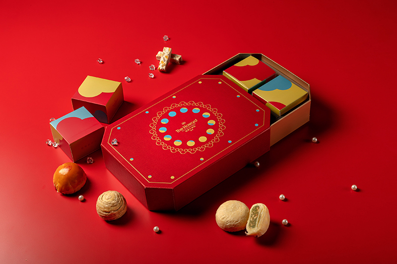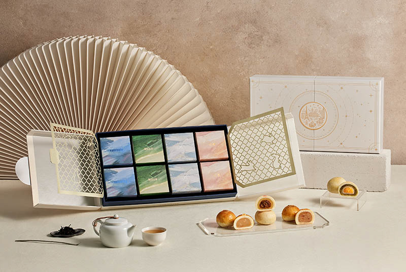 在今年迎來40週年慶的台北福華大飯店,今年首度推出的限量版全手工綜合月餅禮盒,由館內點心坊帶來以「新月‧心願」之名為主題,透過抽象化的福華祥雲紋與月影意象設計珠寶盒外型,內含的全手工月餅有蘇式月餅「香蘭腰果仁」和「伯爵茶紅豆」蛋黃酥兩款,還放入台北福華的代表冠軍伴手禮「香芋番薯牛軋糖」。