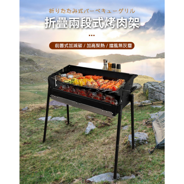 這款折疊兩段式烤肉架專為露營與聚會設計,兼顧實用性與便利性。爐體採用鐵材與鍍鋅板製成,結構堅固耐用,搭配食品級304不鏽鋼烤網與201不鏽鋼爐腳,讓烹調過程更安心。大面積烤網一次能滿足多人份食材需求,無論是串燒、海鮮還是牛排,都能輕鬆應付。其最大特色是兩段高度調整設計,可依需求切換站姿或坐姿烤肉,提升舒適度。