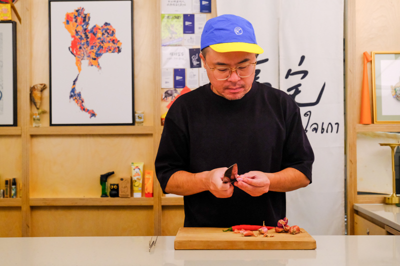有語言學背景的阿高,13年前因緣際會到曼谷教書,是他人生重要的開端,然而一切不如想像中美好,教了一學期就退場回台灣。後來他想著自己已在泰國投資大量時間金錢,不服輸決定再回曼谷試試,借住當地朋友家另尋出路。「朋友家有個家事阿姨P Jid,有天見我閒閒無事,示意坐上她的摩托車一起去買菜。那時的我不懂泰文也不會煮菜,單純覺得好玩,就跟在她旁邊做菜搗醬料。」之後,阿高每天把做什麼菜、放哪些料都寫進筆記,也慢慢地做出興趣和心得,給朋友吃、也分享給街坊鄰居,開心獲得不錯的評價,也改變了他往後的人生。
