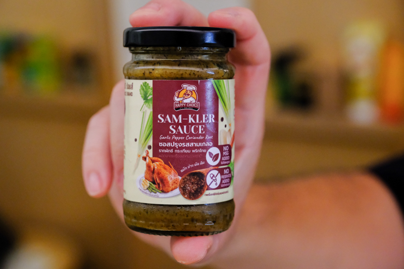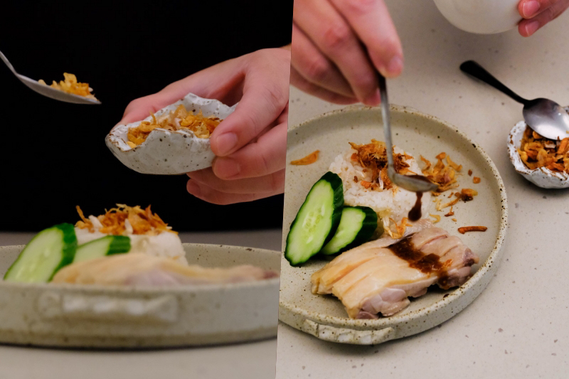 另一道主食「海南雞肉飯 Khao Man Kai」,雞腿肉要嫩不難,所以阿高把重點放在醬料跟飯上。稍微炸完蔥薑蒜後,就用這香噴噴的油炒生米,再加入雞高湯蒸煮。蘸醬則以黃豆醬、甜醬油、辣椒跟薑調製,淋在油亮的雞腿和米飯上,味道真的就像在泰國路邊攤吃到的一樣銷魂。