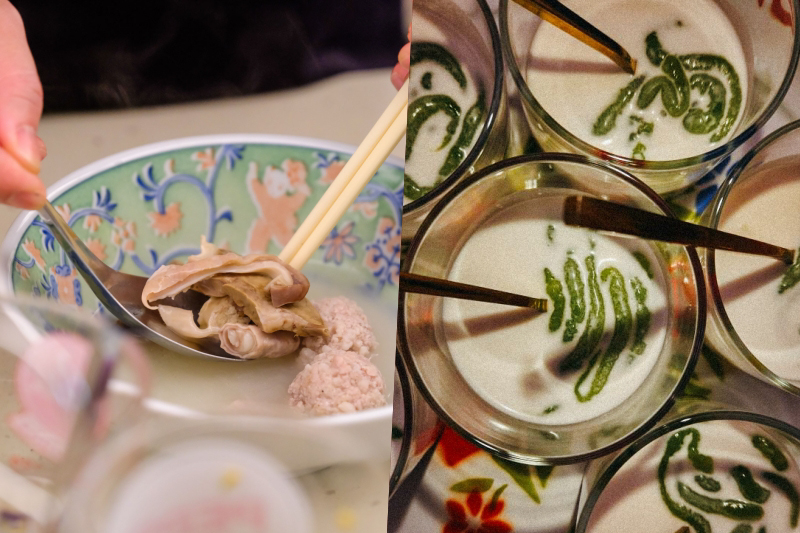 接著是放豬肉、豬心、豬肝和豬血的「豬雜高佬 Kaolao Kreug.nai Mu」,湯口清爽溫和,平衡了前兩道主食稍重的味道,而且內臟嘗來鮮而不騷。「『高佬』是很特殊的泰國飲食文化,不想要吃澱粉時點高佬,老闆就會給你這碗只有料沒有麵的湯。」最後一道甜品是「新加坡香蘭粉條椰奶甜湯Lod Cong Singapore」,通常吃個兩、三口後,阿高就會再幫你加點茉莉花糖,這樣就會更有泰國的味道!