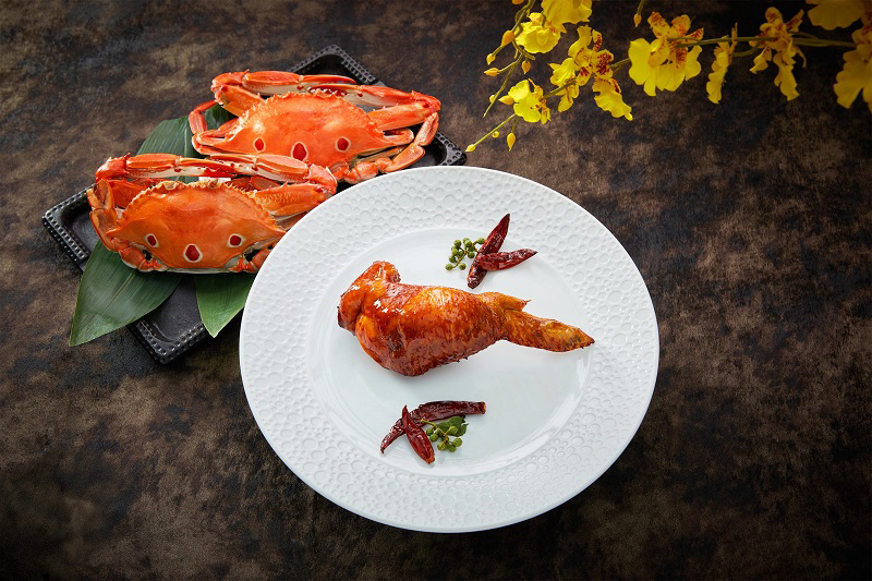 在今年《米其林指南》進入入選餐廳榜單的名娟樓,在今年秋季由中餐行政主廚吳錫卿師傅領軍規劃,帶來七道式的金秋蟹宴套餐。套餐內的蟹肉,集結松葉蟹、處女蟳、鱈場蟹等不同品種的蟹滋味,其中一道「蟹粉龍蝦彩豔盞」的橘紅色澤引人注目,主廚將紅蟳蟹粉、雞高湯共同熬製醬汁,透過紅蟳蟹粉的鮮美,賦予口感飽滿、彈牙的青龍龍蝦更添鮮美。