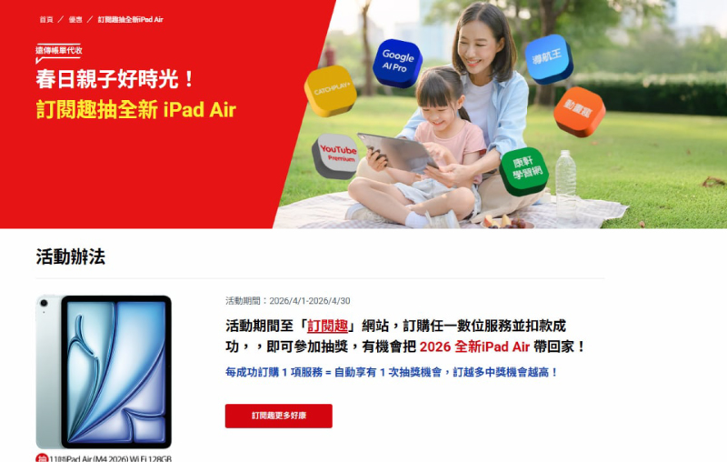 即日起至4月30日,更推出「春日親子好時光」訂閱趣抽全新iPad Air活動,只要成功訂購任一項服務,就有機會把2026全新iPad Air帶回家!除此之外,全站同步祭出多項品牌限定優惠,涵蓋影音娛樂、雲端儲存、交通出行與學習資源等多元方案,這麼多好康千萬別錯過。