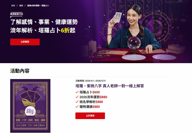每個人都需要了解自己的感情、事業與健康運勢,「算算」提供專業的塔羅占卜與2026流年運勢分析,活動期間只要600元起,還可再享星巴克美式咖啡,寓意「啡」常好運。透過線上服務,用戶能即時獲得專屬命盤與解析,幫助提早布局未來計畫。搭配遠傳「訂閱趣」的代收功能,付款簡單、回饋即時,讓「占卜」不只是好玩,更成為生活中一種正向能量的儀式感。