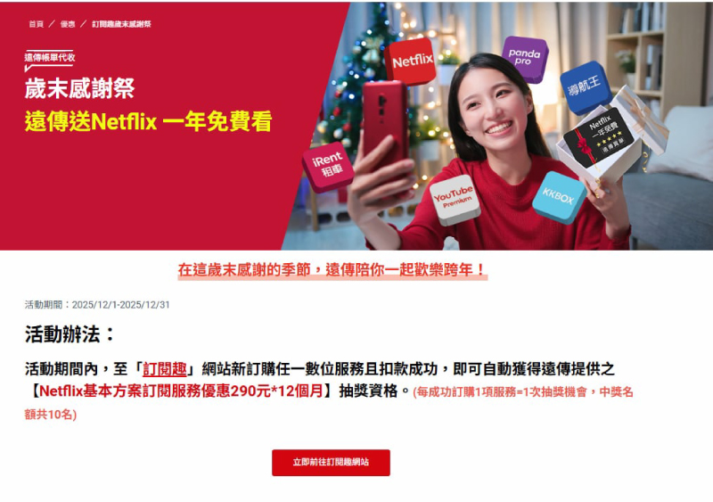 即日起至2025/12/31,遠傳「訂閱趣」推出「歲末感謝祭」活動,只要在活動期間於「訂閱趣」網站訂購任一數位服務——無論是Netflix的追劇時光、KKBOX的音樂陪伴、YouTube Premium的無廣告體驗,或是動畫瘋的滿滿新番——每一筆成功訂單都能獲得一次抽獎資格,有機會獲得遠傳買單的Netflix一年免費看,每成功訂購1項服務就有1次抽獎機會,中獎名額共10名。