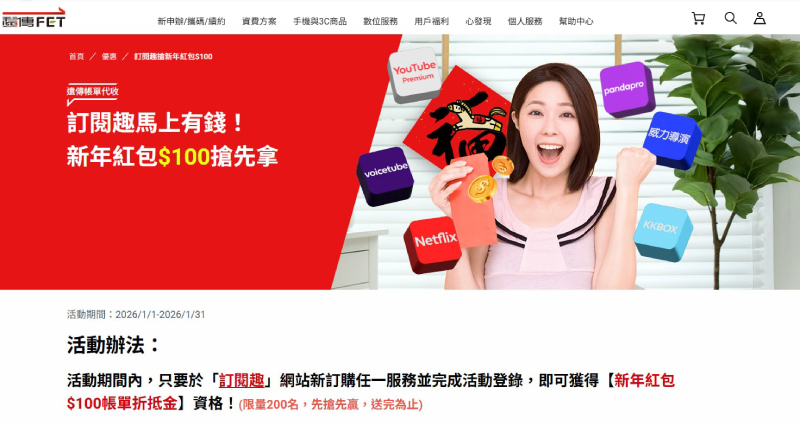 「訂閱趣」馬上有錢活動,只要訂閱任一精選服務,新春紅包100元搶先拿。(圖片來源:遠傳FET)