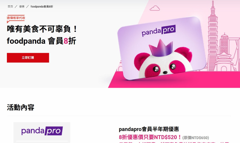 foodpanda:pandapro半年方案8折+再回饋100元(限登錄前200名)