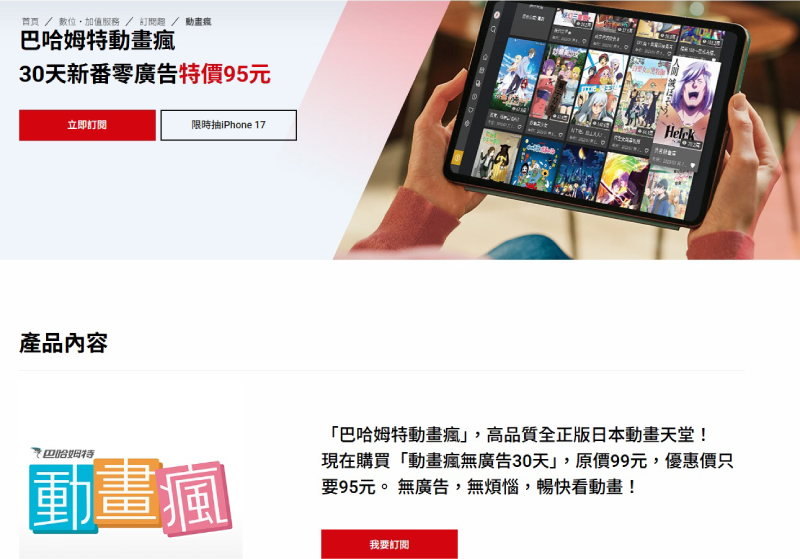 動漫迷的追番天堂!現在透過遠傳「訂閱趣」訂購動畫瘋,30天無廣告只要95元。(圖片來源:遠傳FET)
