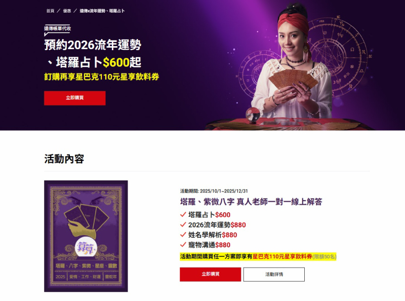 算算:2026流年運勢、塔羅占卜600元起,再享星巴克110元飲料券(前50名)