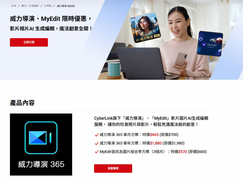在影像生成及短影音盛行的時代,無論是個人創作、社群經營或商業行銷,快速且高品質的影音製作是數位生活的重要需求。威力導演與MyEdit商品正是讓人期待已久的AI影像創意神器,享受宛如魔法般的影像創作體驗。「訂閱趣」提供三種方案,分別是威力導演365單月方案:特價665元(原價700元)、威力導演365單年方案:特價1,880元(原價1,980元)、MyEdit音訊及圖片組合季方案(3個月):特價570元(原價600元),想讓你的珍貴照片與影片,輕鬆充滿魔法般的創意就趁現在。