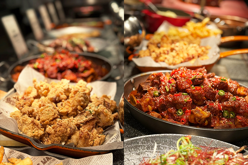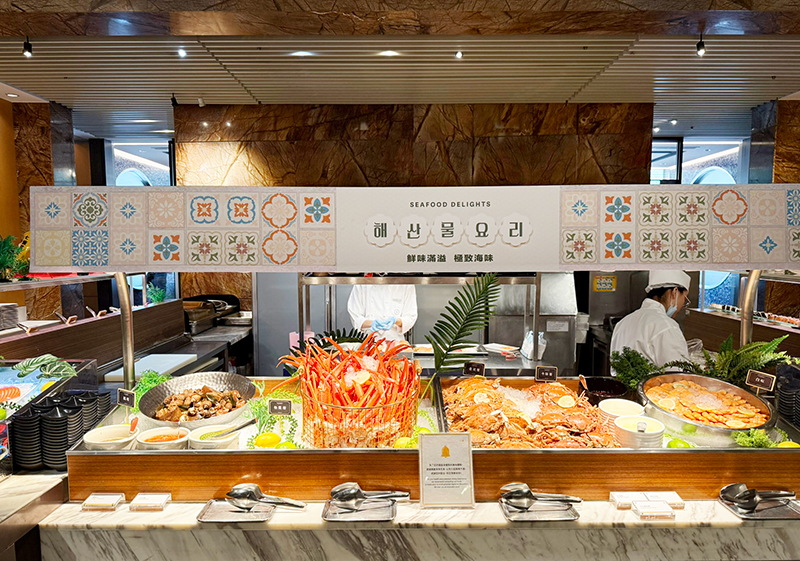 其它因韓劇熱播而掀起風潮的多款料理也等著你,例如辣炒年糕、海鮮煎餅、紫菜飯捲、水冷麵等,另外還很容易被錯過的韓式小菜區,非常值得多吃一些,因為這不僅是韓國重要飲食文化,孫榮主廚還特地親手製作200公斤韓式泡菜與50公斤蘿蔔泡菜,從食材脫水、醬料調製到以糯米水發酵,每一步皆嚴謹細緻。小菜區有多達數十種品項,包含經典的辣拌魷魚、麻藥蛋與韓式蔬菜冬粉。