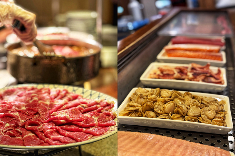 你我熟悉的韓式烤肉,當然也不缺席,以鳳梨、洋蔥、水梨、蘋果與啤酒醃製肉質,可以軟化纖維並帶出果香,再拌入辣醬與水果烤肉醬,風味清爽不油膩。鐵板區提供三款招牌肉品:「韓式川辣豬五花、韓式碳烤豬肉、韓式碳烤板腱牛」,搭配美生菜與三款特製醬料,重現正宗韓國烤肉魅力。假日午晚餐限定更升級為「現煎帶骨牛小排」,肉肉愛好者會吃得很過癮。