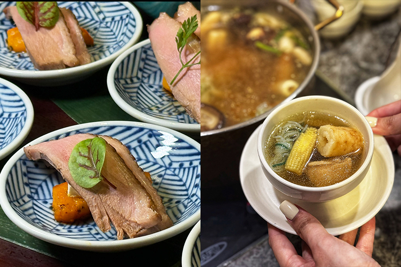 圖左為宮城栗子南瓜舒肥鴨胸,圖右秋田米棒雞湯鍋,好吃好喝。(圖片來源:Sid)
