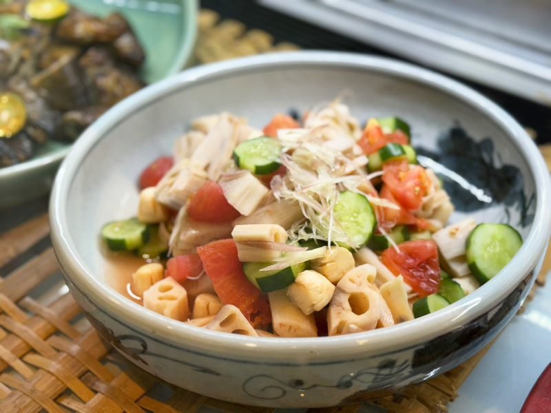 將焦點轉到以蘋果聞名的青森,除有小巧的「青森蘋果千層」,還有「青森梅香干貝野菜」,選用來自日本沿岸的小福貝,搭配茗荷、小黃瓜與蓮藕,佐以青森漬梅涼拌而成,口感清爽脆口,酸香開胃,是青森地區常見的家庭冷菜。