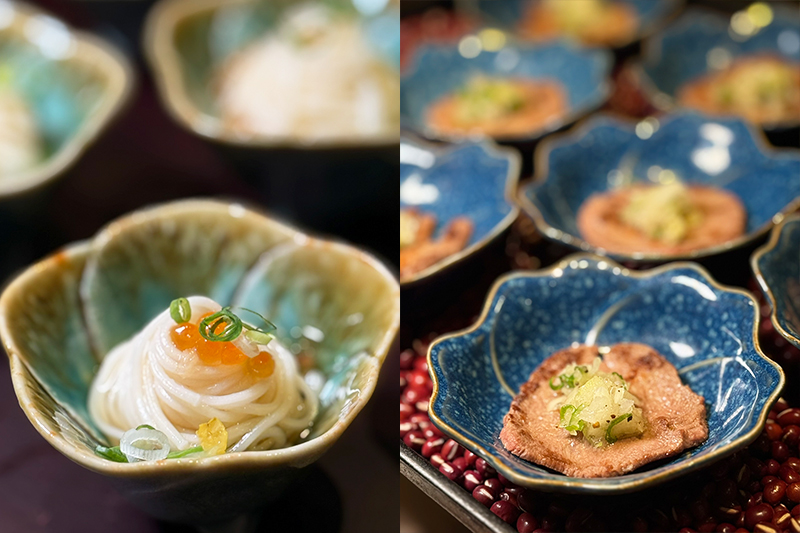 另外,像是來自岩手的冷前菜「胡桃豆腐」,料理長每日現剝核桃、研磨成粉後加入日本葛粉調製而成;以日本赤味噌醃漬比目魚肉兩日後爐烤料理而成的「福島味噌時魚燒」,也都是此季主題的主打款。不過,還有一樣是來自宮城的「仙台炭香牛舌燒」,只在晚餐餐期提供,千萬別忽略了。料理長選用牛舌最富彈性的中後段,以直火炙燒至五至七分熟,外層帶有粉嫩、肉質柔嫩,搭配鹽蔥醬汁,是東北地區代表性的炙烤料理之一。