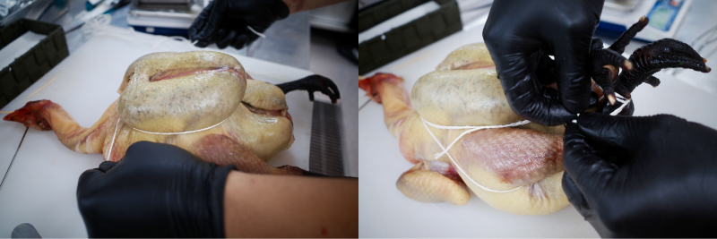 綁雞(Truss chicken)的步驟,先打結固定胸部,再依序從脖子繞過雞腳,烤過的雞隻在昂首挺胸狀態下顯能烘烤均勻。(圖片來源:Rene Hung)