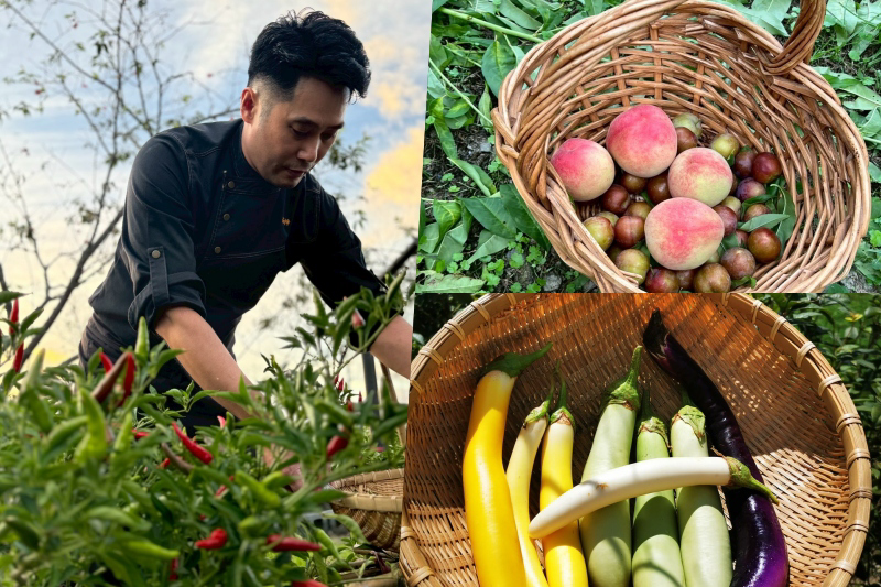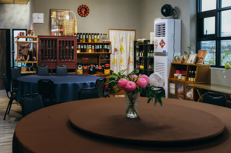 不只選用好食材,他和花小姐也自己種稻米和蔬果。山上以水蜜桃為主、林下種植咖啡和大量香菜。菜園裡少不了蔥、薑、辣椒、九層塔和金桔,還有香茅、檸檬葉等香草植物,除了入菜也做成加工品販售。老櫥窗擺滿自釀水果酒,以及放點辣椒乾增加層次風味的鳳梨豆腐乳,還推出三款不同風味的辣椒醬:麻辣嗨、辣椒爽、XO醬。當然,他們也將可利用的廚餘做成堆肥,澆灌回菜園做低碳排的自然循環。