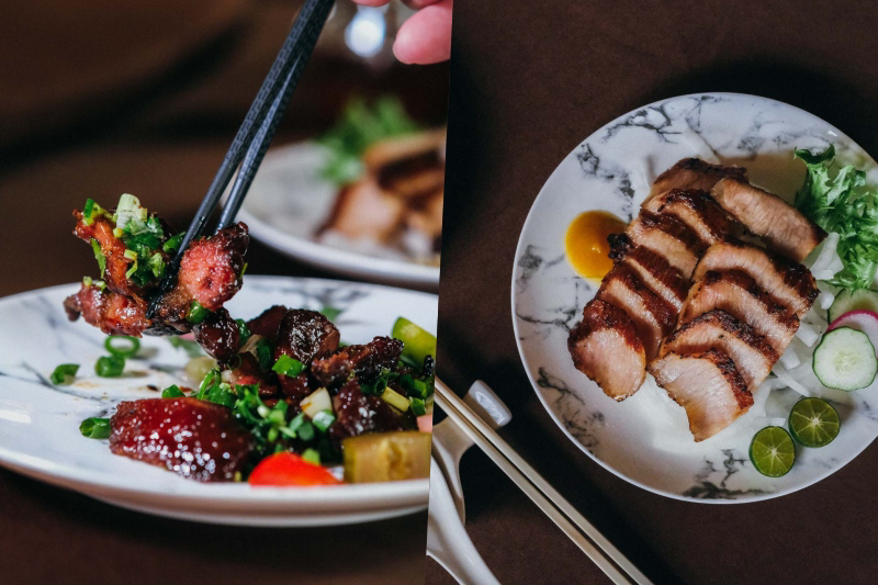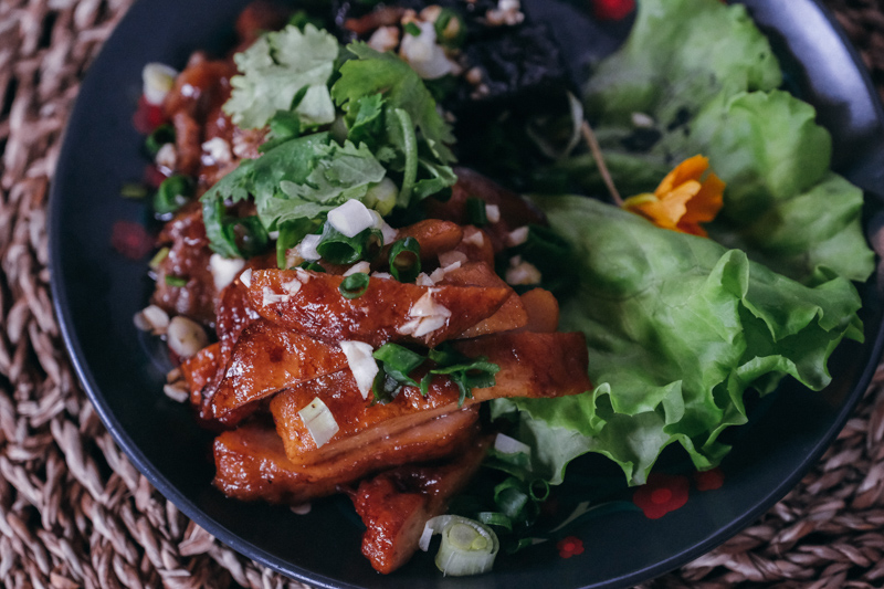 豬肉料理皆選用肉質鮮嫩、油花分布均勻的宜蘭溫體黑毛豬,「蜂蜜醬烤厚切豬排」取梅花部位厚切近2公分,先醃香料再上火烤,烤完加碼抹上蜂蜜醬和三星蔥再次炙燒,甜香甜香很像叉燒但更有嚼勁。