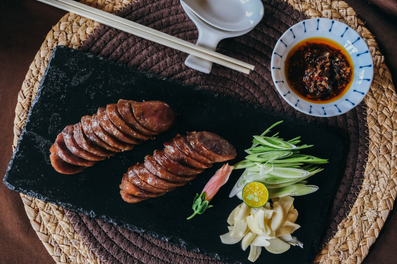 另一道大片厚實的「松板豬」同樣先醃再烤,沾點微酸的自製金桔醬入口,和豬肉天然的鮮甜非常合拍!香腸遵循阿祖代代相傳的配方、裡頭加了高粱酒、五香粉和多種中藥辛香,以豬腸做為腸衣,沒有任何化學添加,從裡到外真材實料的古早味,也讓不少長輩客人吃到瞬間回憶起兒時稱讚不已。
