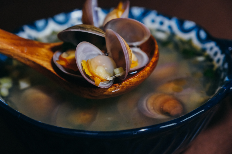 湯品看似簡單但一樣厲害。「通常上湯時客人第一個反應,就是怎麼給那麼普通的東西,但仔細看又驚呼竟然是稀有高檔的『赤嘴』!」花小姐笑說。她也進一步解釋,選自彰化芳苑的赤嘴,是目前唯一無法人工養殖的貝類,加上在潮間帶採集風吹日曬非常辛苦所以更顯珍貴。飽滿的蛤肉配上明豔欲滴的橘嘴,煮好再灑點三星蔥和同是芳苑油籽學堂的黑芝麻油提味,湯汁清澄鮮甜帶著油香暖胃也心暖心,咬下去在嘴裡爆炸噴汁太滿足了!