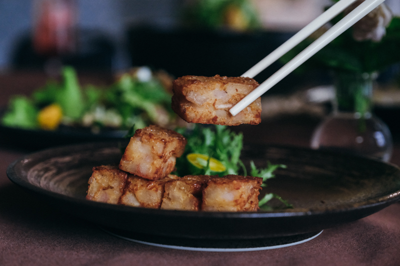 當初為了找理想的魚,現主廚和花小姐數度南下走訪多家養殖場。「不過當我們開進養殖場時飄散著魚腥味、飼料味和水的臭味,光聞就不舒服,怎麼可能用養出來的魚做菜呢?」最後,他們回頭找到宜蘭冬山的柯林漁場,選用在地湧泉活水循環過濾和益生菌配方飼料養殖的鱘龍魚。無骨魚菲力配上純米米粉,這道「鱘龍魚蒸米粉」一打開蒸籠舒服香氣便襲面而來,而且肉質不僅紮實更是細膩Q彈。