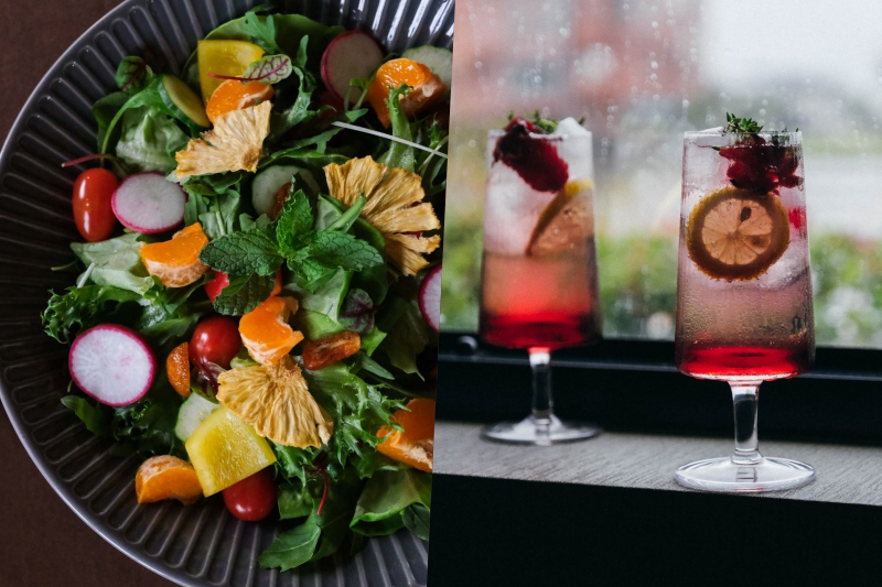 每天都會長不一樣的季節性沙拉,其中選用了礁溪林美的有機金棗的格外品,因為花小姐認為,自己種就知道有多不容易,每顆都是心血要珍惜。飲料則是紫蘇青梅氣泡飲加上洛神、檸檬和紅肉李。(圖片來源:細腿男)
