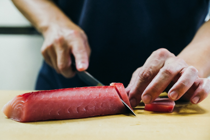 「再來就是得親手摸」,可能外表看來眼睛清亮、顏色明豔,但他一摸便知新不新鮮。早上、下午各採買一次,連平日都要準備近百條魚以餵養嗷嗷待哺的客人。「所以我常常不是正在摸魚,就是在摸魚的路上。」他笑說。而魚買回來就要儘快把魚鰓、魚肚內容易氧化腐敗、影響肉質風味的東西清掉,以保存在最鮮美的狀態。