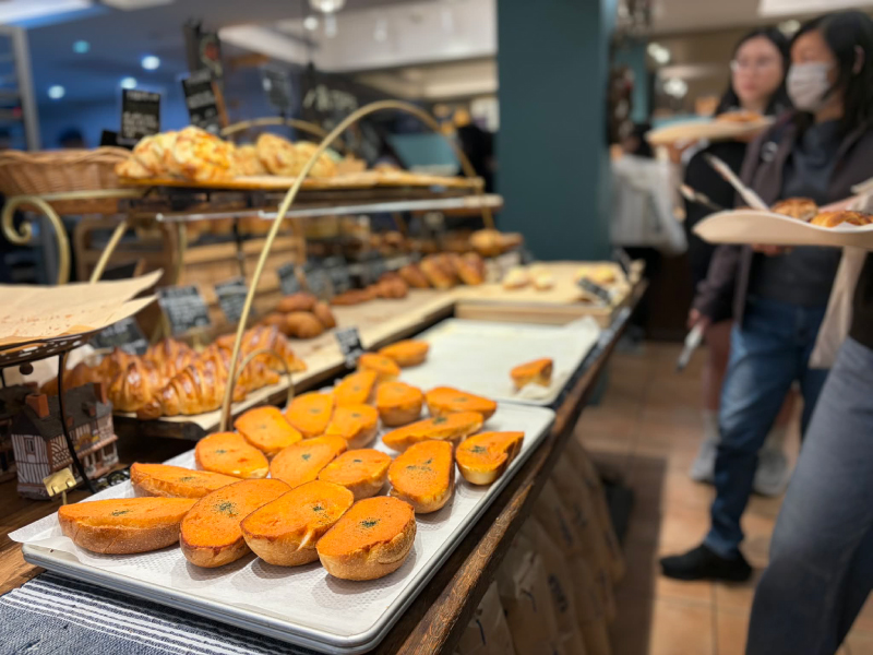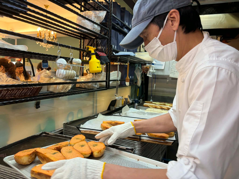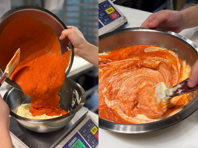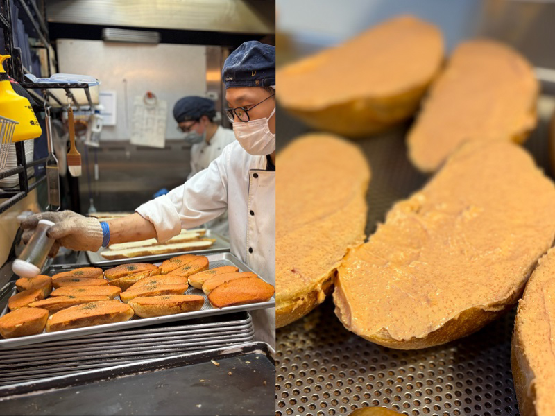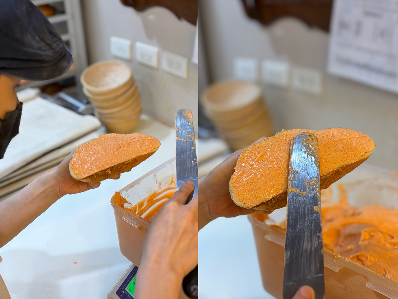 在巢屋的店鋪裡,外頭的客人冷著寒風排隊,進入到店鋪的客人則搜刮起明太子麵包,另一頭開放式的烘焙現場宛如產業線,有人負責翻拌調和明太子醬,有人負責快速將明太子奶油抹上麵包表面,師傅動作俐落地三兩下就讓明太子奶油均勻抹平於表面,連側面都收邊得漂亮。