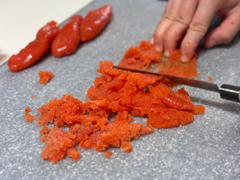 醃漬過的辛口明太子顏色帶橘紅,與奶油、美乃滋等調和翻拌,還會再加入檸檬汁去腥。(圖片來源:Rene Hung)