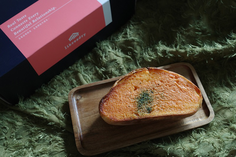 巢屋明太子麵包的麵包體酥脆不硬,在烤後出爐再撒上價格相較一般海苔更貴、香氣更佳的青海苔粉。(圖片來源:Rene Hung)