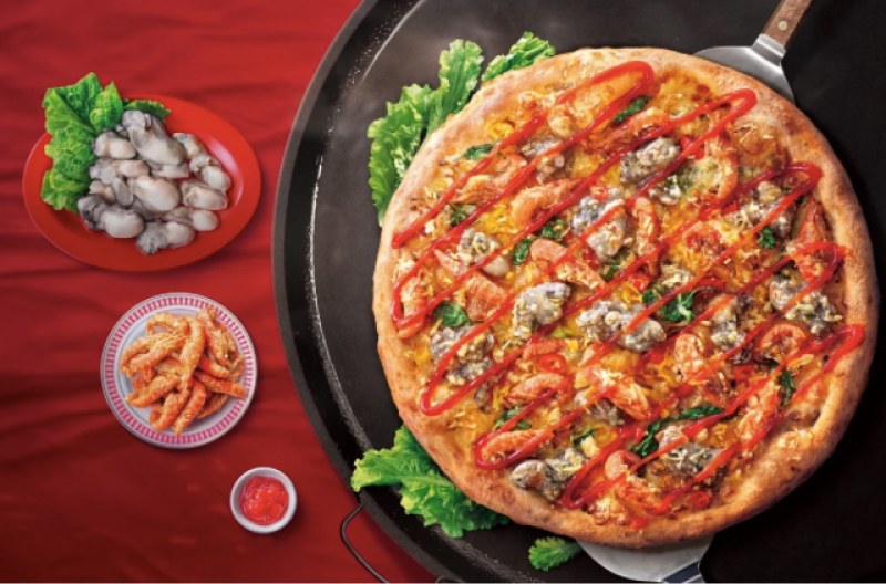 台灣人最愛的另一項美食是火鍋,2020年必勝客與鼎王合作推出麻辣鍋口味的比薩,花椒油、老油條、牛肚等配料擺滿滿,一口咬下可以感受到刺激的麻辣口感。