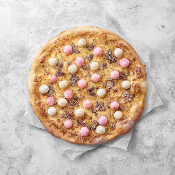 必勝客搞怪,喜宴定番菜色不缺席,花好月圓花生湯圓比薩是一款將台灣甜品與比薩結合的產品,花生粉、湯圓搭上餅皮,咀嚼香Q口感超過癮!