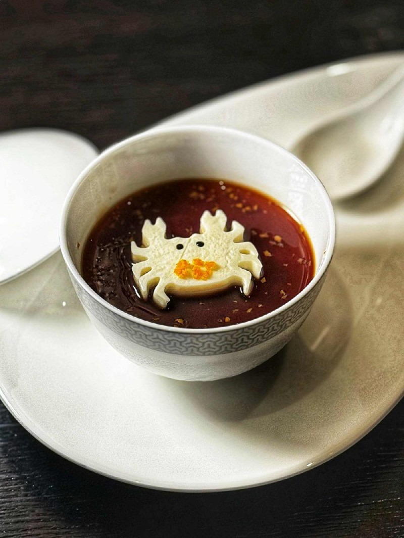 陳皮紅糖糯米山藥,以老紅糖慢火熬煮製成糖漿並將新鮮橘皮切末放入,讓橘皮的清香融入老紅糖漿的甜味,鋪於頂層的螃蟹模型奶凍則是以糯米山藥、牛奶和鮮奶油攪拌打勻塑形而成,山藥與牛奶結合的軟糯香氣配上老紅糖水的絲滑甜口,不僅暖胃祛寒、緩解蟹的寒性。